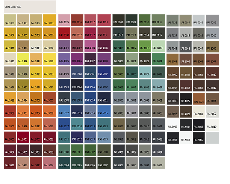 La carta RAL es de uso muy común. Originalmente la carta RAL contaba con 40 tonos, aunque en la actualidad su número es mayor.